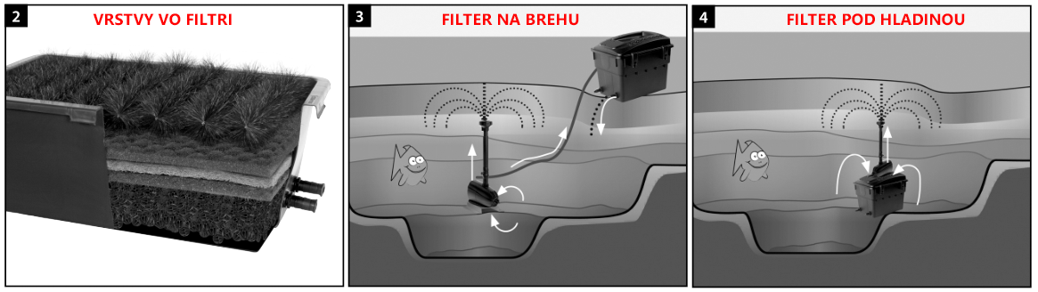 Pri tomto spôsobe používania je potrebné uzatvoriť otvory na bočnej stene filtra, ktoré sa používajú na výtok vody vtedy, keď chceme filter postaviť na breh jazierka. V takomto prípade (obr. /1/) čerpadlo, ktoré je v jazierku, tlačí cez hadicu a horný otvor na bočnej stene filtra vodu do vnútra filtra, kde následne preteká cez všetky filtračné vrstvy.